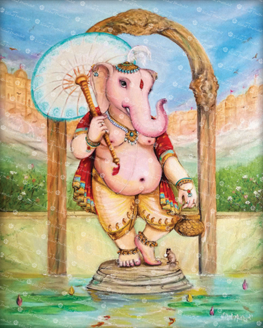 This painting portrays the beauty and significance of Lord Ganesh. The deity, with his pot-bellied and elephant-headed form, is revered as the lord of new beginnings. The artwork includes symbols and elements such as Ganesh’s mount, the rat, and several other attributes